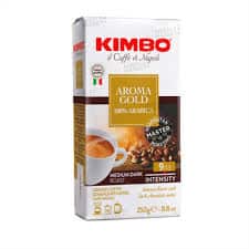 Kimbo „Aroma Gold” 100% Arabica este o cafea italiană premium, obținută din boabe Arabica atent selecționate, prăjite tradițional în Napoli. Oferă un gust fin și echilibrat, cu arome elegante, aciditate delicată și note florale și fructate, specifice cafelelor Arabica de calitate superioară.