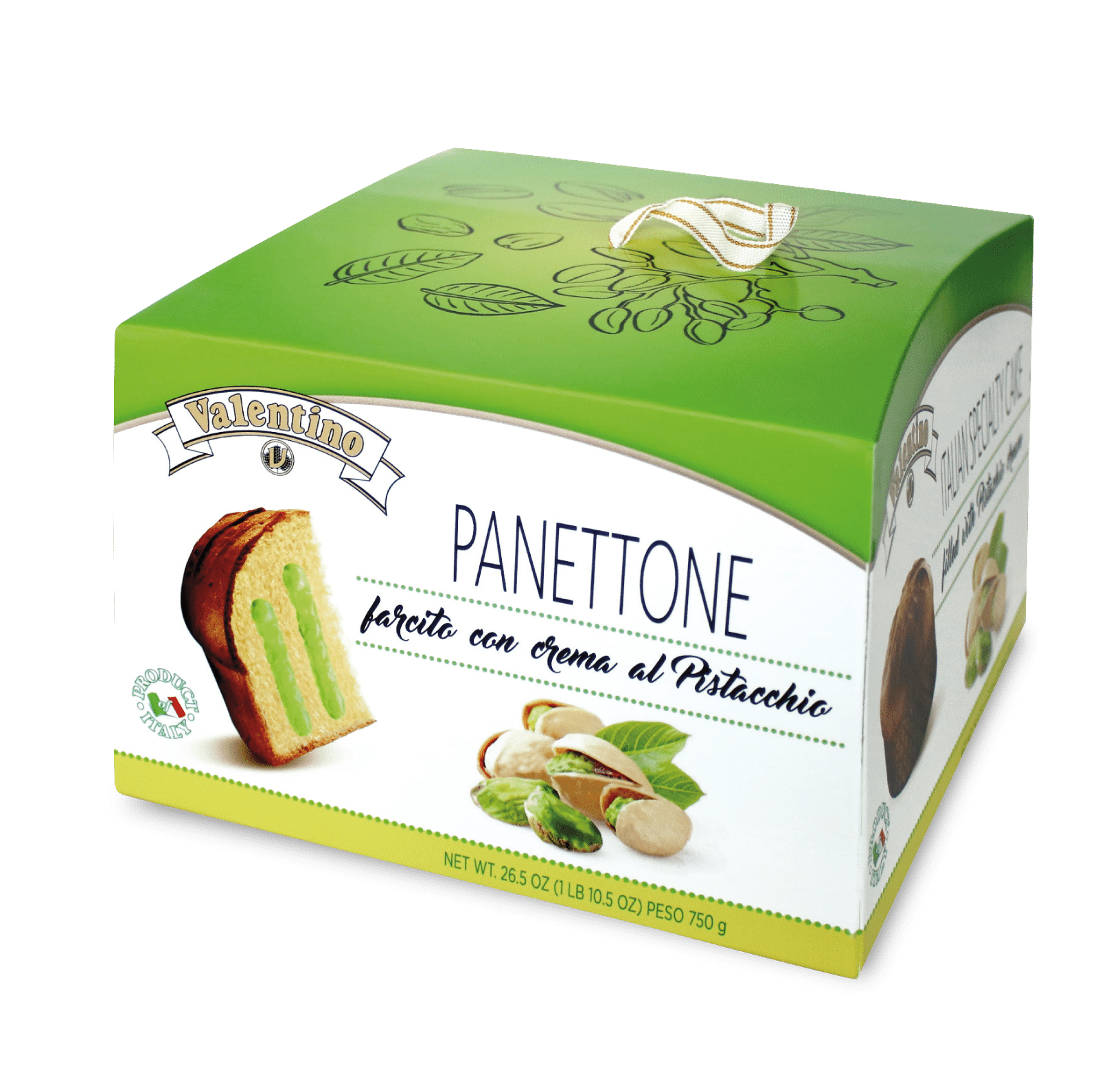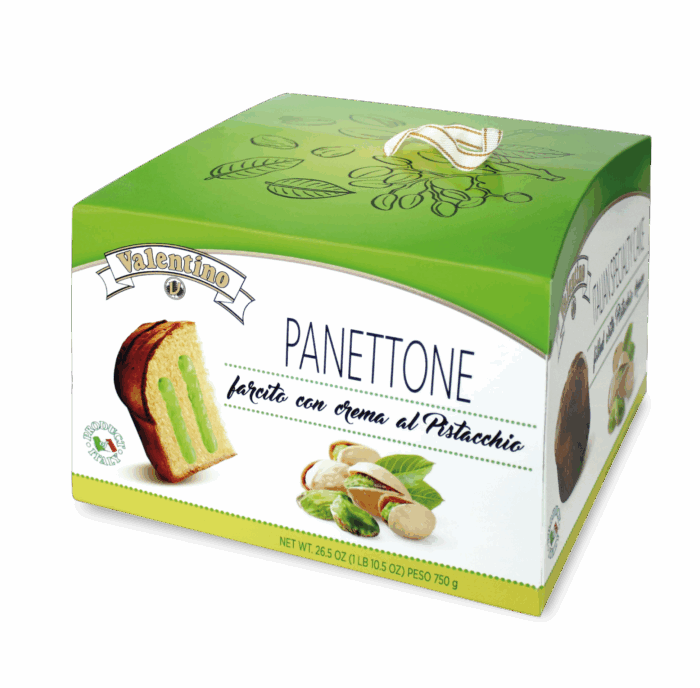 Panettone “Valentino” Crema al Pistacchio este un desert italian rafinat, cu aluat moale și pufos, dospit lent, umplut generos cu cremă fină de fistic. Gustul intens, textura catifelată și aroma bogată de fistic transformă acest panettone într-un desert deosebit, perfect pentru momentele festive sau pentru a fi oferit cadou. Produs premium, 100% italian, fără coloranți artificiali.